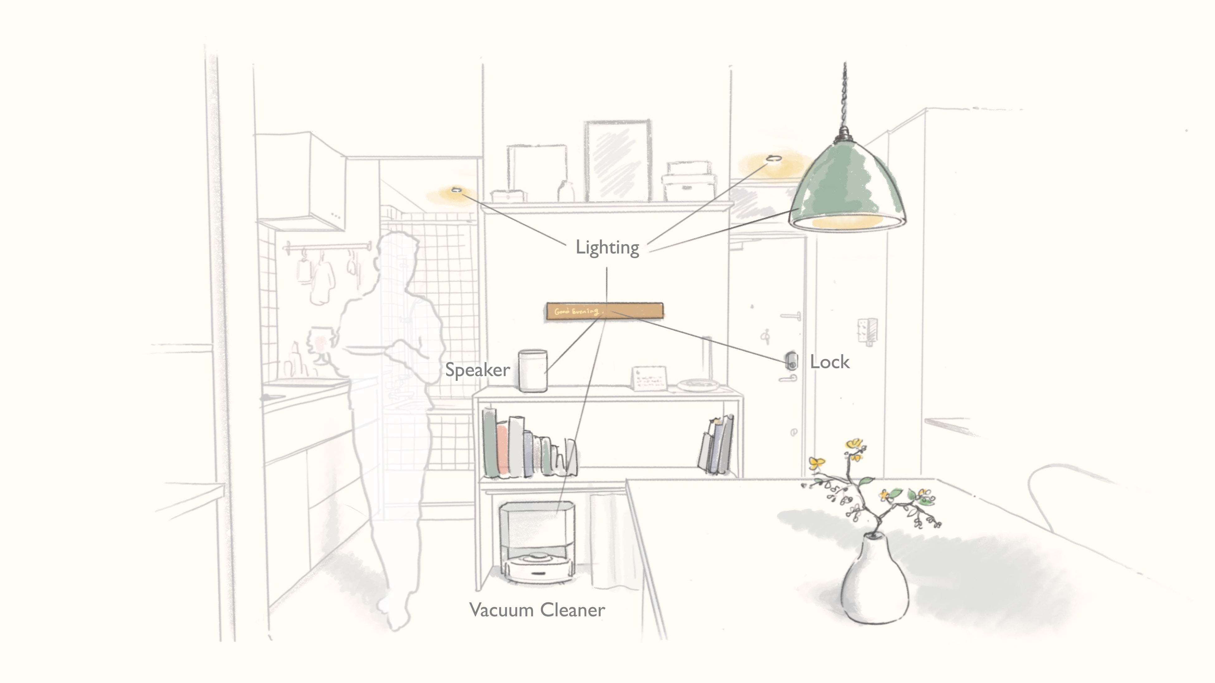 Matter対応のmuiボードがあれば、これひとつで照明・エアコン・スマートロック・ロボット掃除機・スピーカーといったさまざまな家電が操作できるようになります。muiボードとMatter対応家電は、スマートフォンとBluetoothイヤホンを接続するときのように機器同士で連携ができ、クラウドを介さずローカル接続での使用が可能になります。
