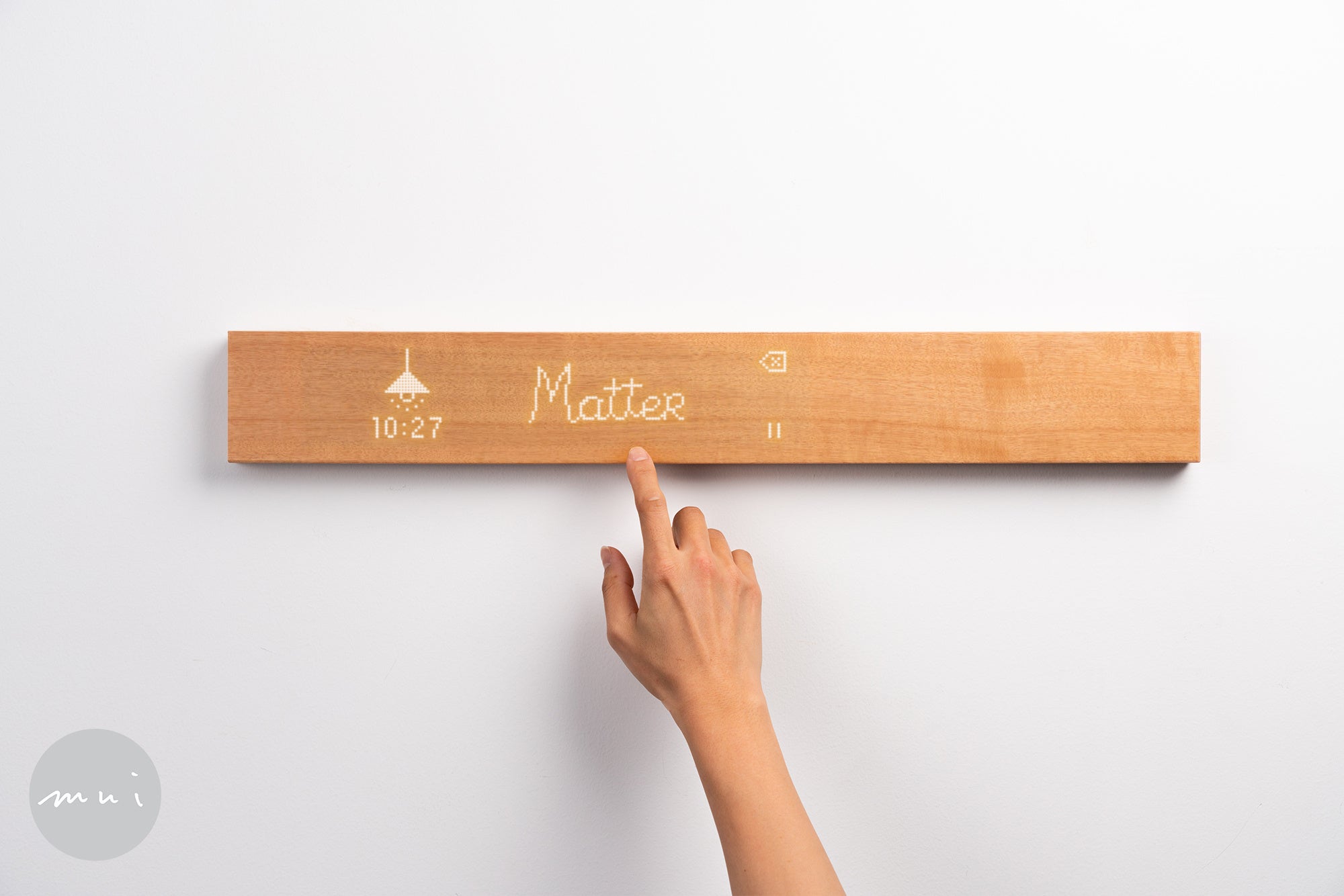 muiボードは、天然木でできたタッチパネルに触れることでさまざまな家電を操作できる「リモコン」のような機能を持っています。デジタル機器ですが、普段は家具のように生活空間に調和するデザインにこだわりました。必要なときにだけ情報が表示され、使わないときは一枚の木の板のような姿に戻ります。最先端の技術を搭載しながら、アナログ感のある親しみやすい見た目や、直感的に操作ができる画面のデザインが特徴です。