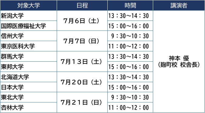 医学部進学に専門特化した河合塾麹町校は、医学部進学を志す中高生・保護者の皆様を対象とした大学別の医学部医学科セミナーを7月に全10回(10校)開催します。