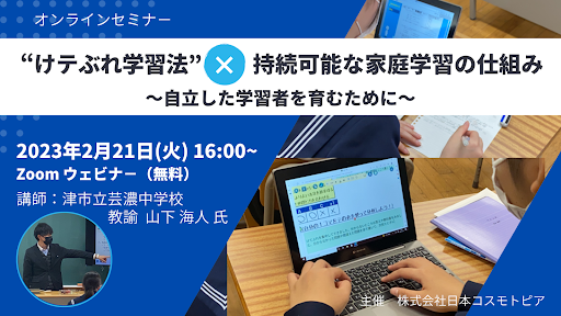 「自立学習」「生涯学習」を事業の軸とし、学習塾・学校・生涯学習教室向けICT教材システムの企画・制作・販売を手がける株式会社日本コスモトピア(本社:大阪府大阪市、代表取締役社長:下向 峰子、以下:日本コスモトピア)は、学校関係者、教育委員会ご担当者を対象とした無料オンラインセミナー「“けテぶれ学習法”を活用した持続可能な家庭学習の仕組みづくり~自立した学習者を育むために~」を、2月21日(火)16:00-17:00に実施します。セミナー申込URL:https://gakukura.cosmotopia.co.jp/news/20230201/
