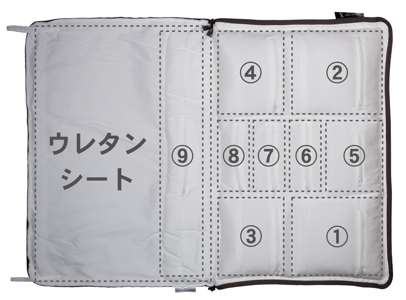 枕の内側は複数の分割ポケットに分かれ、お好みにあわせて絶妙な高さ調節ができます。また簡単に高さ調節ができるウレタンシートが付いているので、ご自宅でも高さ調整が可能です。またポケットに入れる中材は作成時に9種類からチョイスできます。ポケットごとに異なる中材を選べるなど柔軟にカスタマイズができるのも魅力。