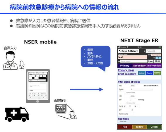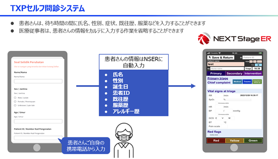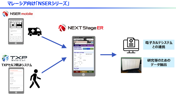 現在マレーシアの実証事業対象病院にて、救急車での搬送にて利用する「NSER mobile」、患者向け問診システムである「TXP Self Assessment System」、病院内でデータを受け取り、電子カルテとの連携・業務支援を行う「NEXT Stage ER」 (以下、NSER) を利用して、救急医療データのワンストップ連携が行われ始めています。