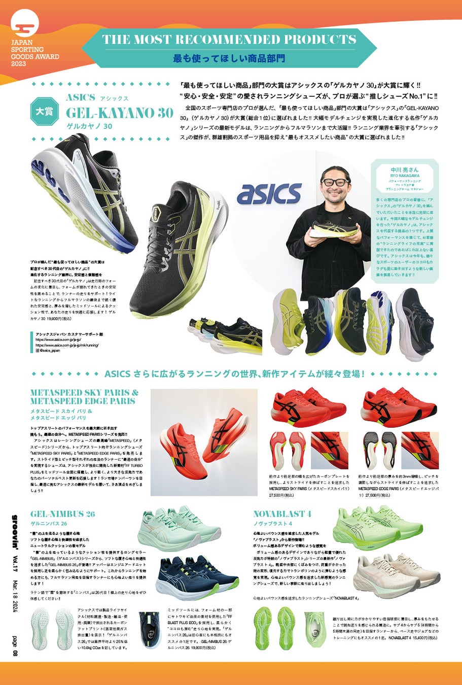スポーツ専門店のプロが選んだ今年「最も使ってほしい商品」部門の大賞は、「アシックス」の傑作シューズ「ゲルカヤノ30」が輝きました!! 途切れない安定感と、最後まで続く信頼感のランニングシューズがオススメ商品の最高峰に輝きました!! 2位は最も売れた商品部門の大賞にも輝いた「ホカ」の「クリフトン」シリーズが輝き、3位は野球用品のメンテナンスに欠かせない「ミズノ」の「爽香守」シリーズが選ばれました!