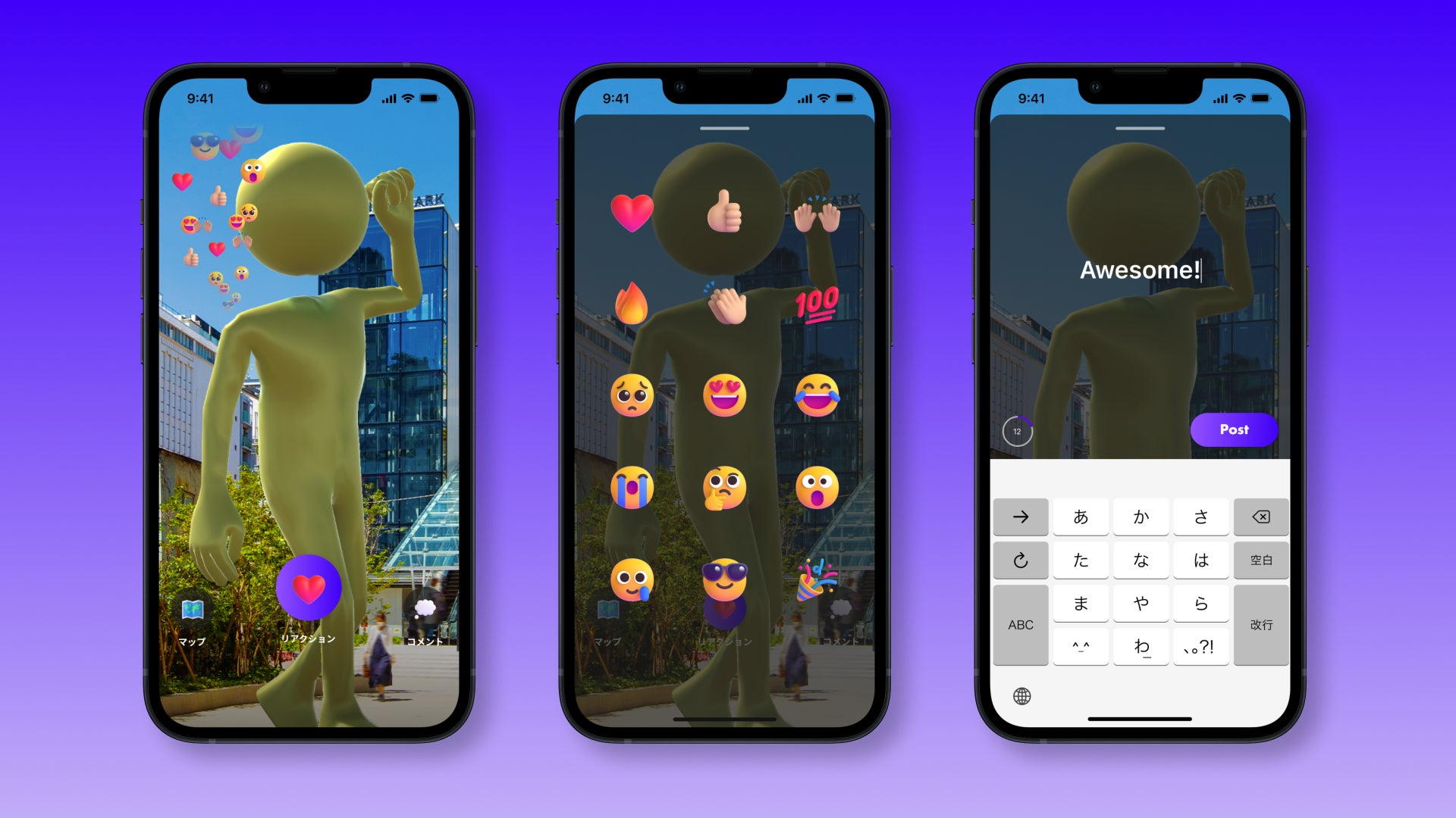 (1) モバイルARアプリ:普段出歩いたり、ショッピングを楽しむ都市の風景を、アプリのカメラで覗いてみましょう。他のユーザーがこれまでに置いた3Dコンテンツが街中に置かれています。それは誰かへのメッセージであったり、街を明るくするモニュメントだったり、表現は様々です。気が向いたらリアクションやコメントを残すことで、3Dコンテンツを介したコミュニケーションを楽しみましょう。
