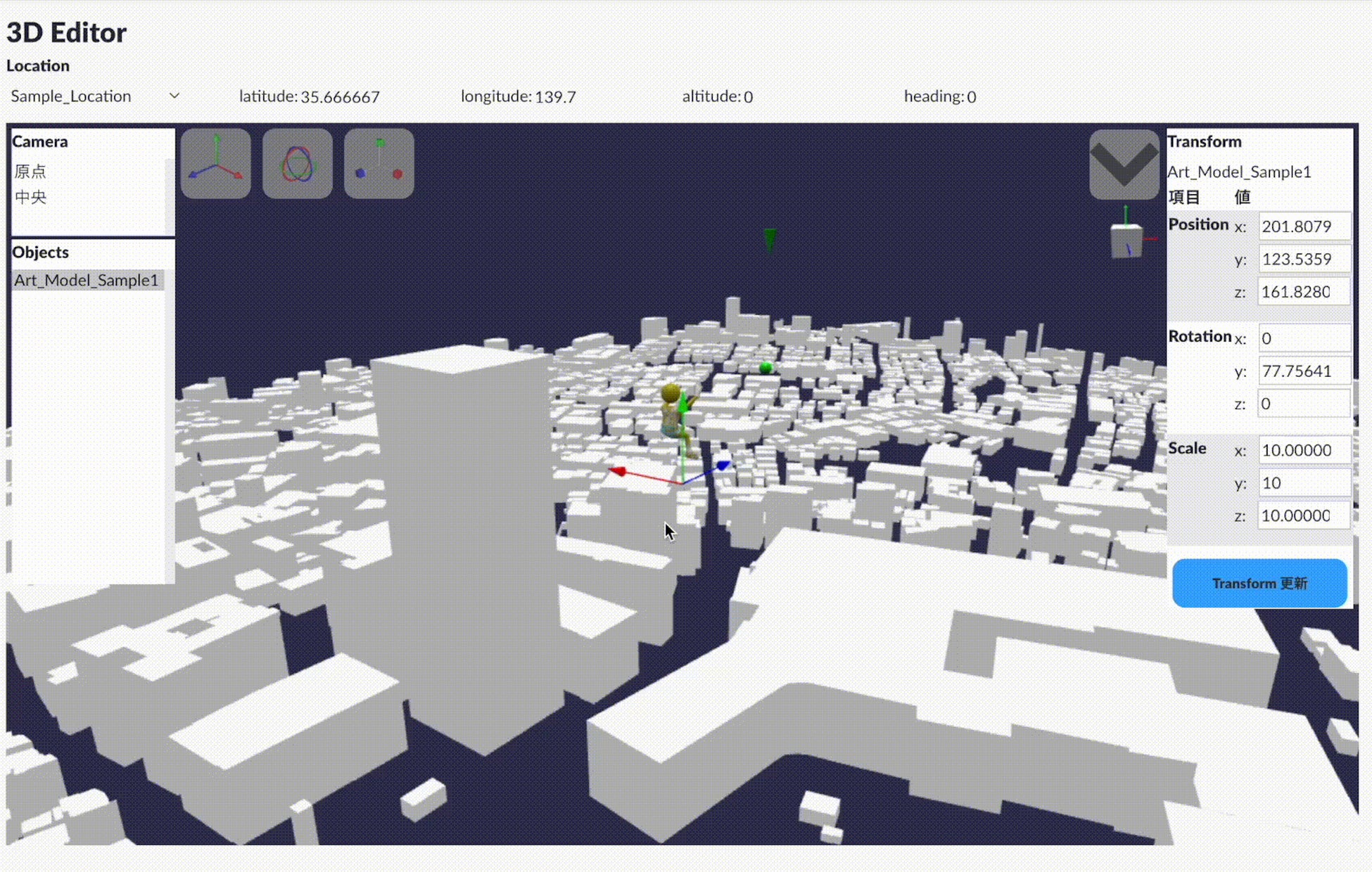 Webメタバース環境は、ウェブブラウザからアクセス可能な環境として構築しました。3D都市モデルを使って構築されたバーチャルな都市空間の中を自由に歩き回りながら、物理的な街でARコンテンツを鑑賞するのと同じように、コンテンツの鑑賞を離れた場所からでも行うことができます。