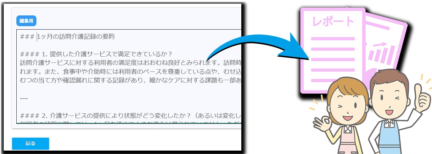 変化、サービス満足度、今後のケアプラン変更要否などを文章として自動生成します。