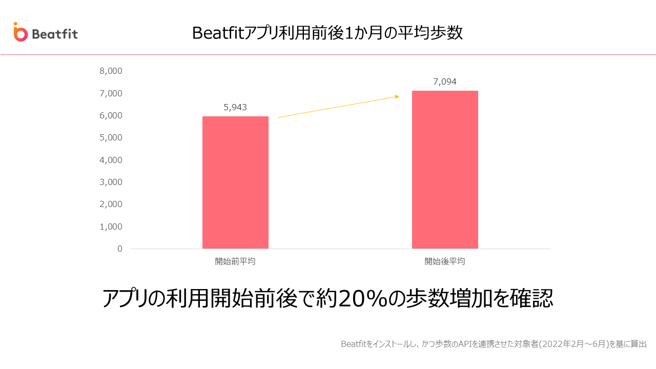 誰でも手軽に運動習慣を身に着けることができるパーソナルフィットネスアプリ「Beatfit」を運営する株式会社アリストル(本社:東京都渋谷区、代表取締役:宮崎 学、以下『当社』)は、2022年2月にリリースした歩数計測機能のデータをベースに、Beatfitのインストール前後でユーザーの歩数が実際に増えたかどうかを検証しました。結果、平均して約20%の増加を確認し、withコロナ時代において問題となる運動不足解消に向けた健康経営ソリューションとしての価値を実証しました。今回の結果を踏まえ、当社は健康経営銘柄、ホワイト500、ブライド500の取得を目指す健康経営推進企業への導入促進を目指しサービスを拡充してまいります。