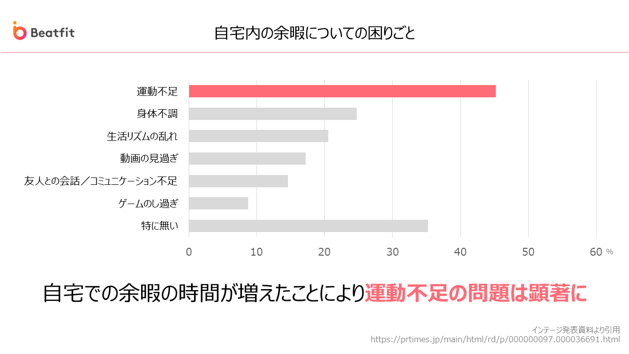2020年の新型コロナウイルスの蔓延により、各企業でリモートワークが定着しました。リモートワークが推進され自宅内の余暇の時間が増えた結果、これまで通勤時間で担保されていた活動量がなくなり、運動不足に伴う心身の不健康が問題になっています。