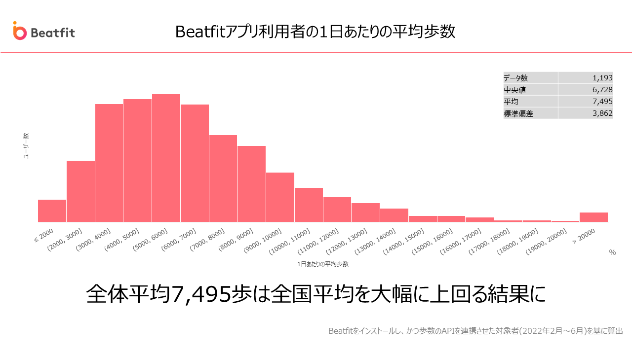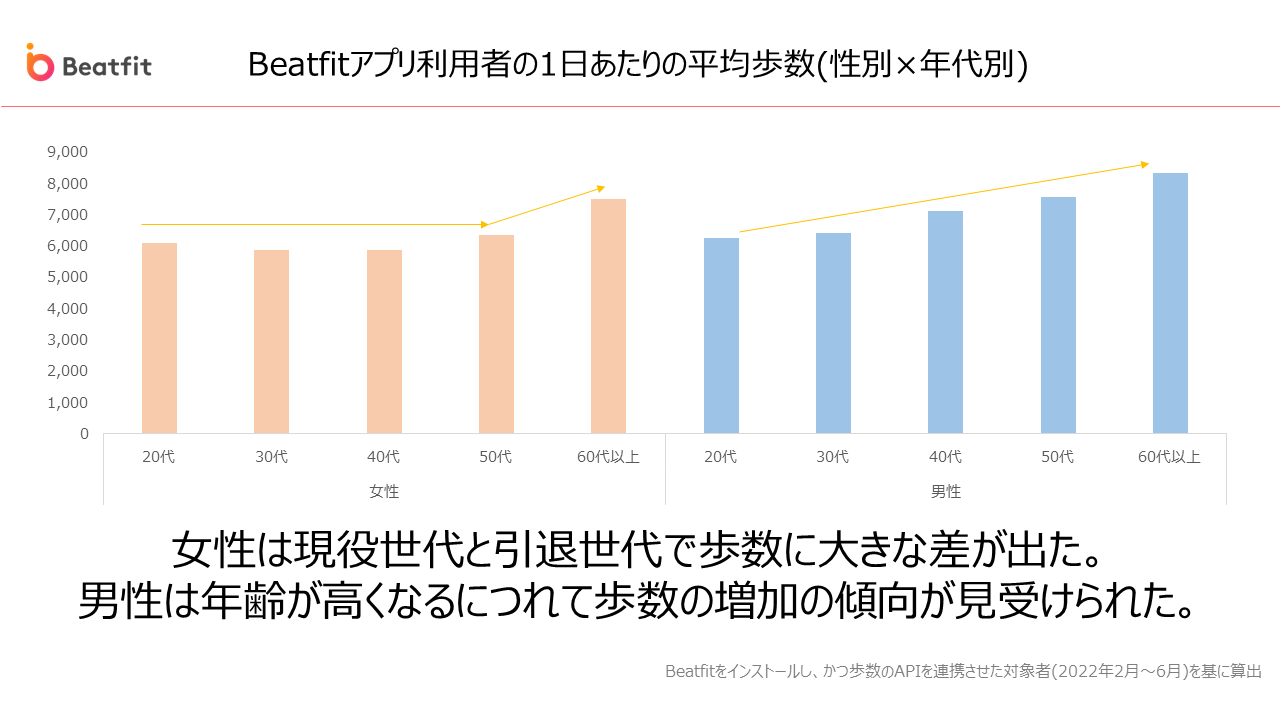 国交省の発表(https://www.jili.or.jp/lifeplan/rich/1255.html)によれば、一日の平均歩数は男性が6,793歩、女性が5,832歩とされています。今回の調査を通し、Beatfitアプリ利用者の1日あたりの平均歩数が7,495歩であり、男女問わず全国平均を大幅に上回ることを確認しました。