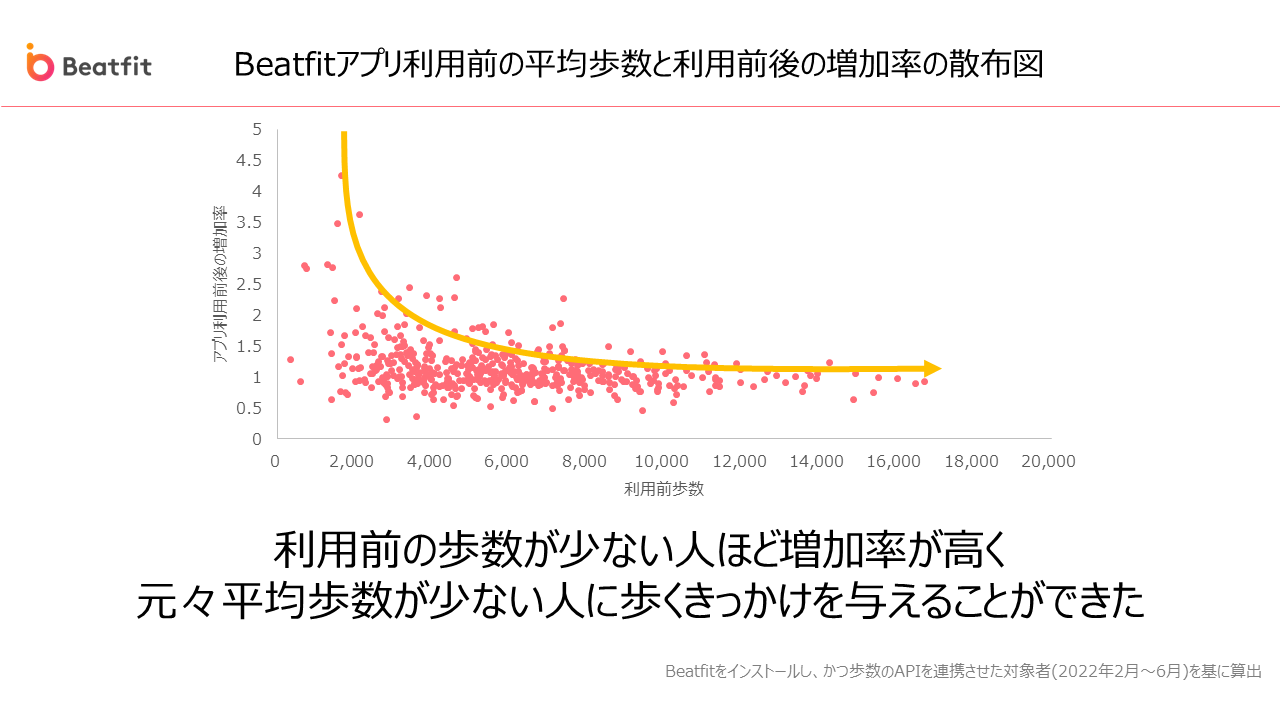 分析した結果、アプリ利用前30日と利用後30日では、平均して約20%の増加を確認することができました。また、利用前の歩数が少ない人ほど増加率が高いことも確認できました。Beatfitでは、「これまで運動しなければいけないと思っていたがなかなか行動できなかった人」をメインターゲットにサービスを開発してきましたが、今回の分析を経て、当社がターゲットしていたもともと運動していなかった非アクティブ層にサービスの価値を歩数増加という形で提供できていることを実証することができました。