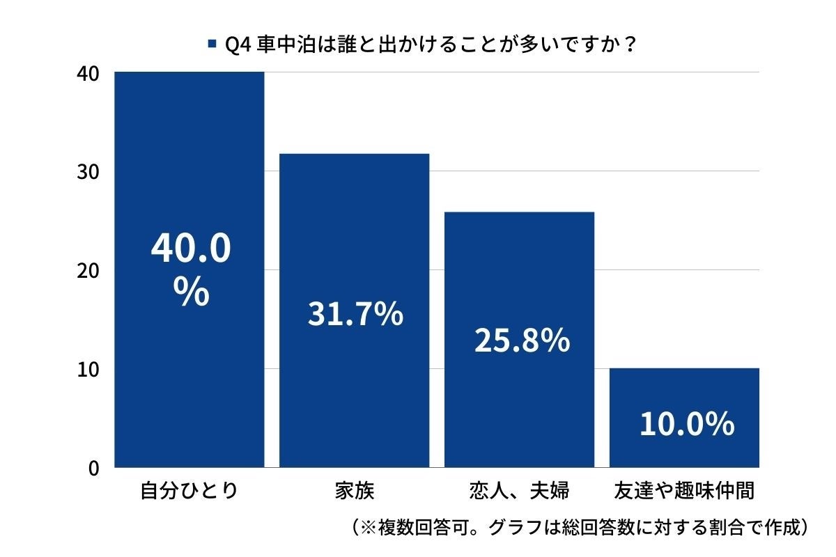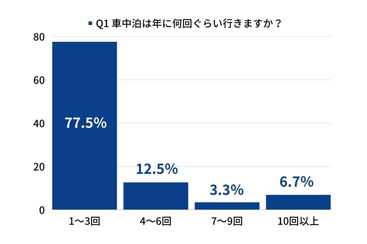 ただ「10回以上」と答えたヘビーユーザーが6.7%もいらっしゃいました。これは、日頃から車中泊に必要なツールをクルマに詰め込んでいて、いつでも気軽に出かけられるようにしているのかもしれませんね