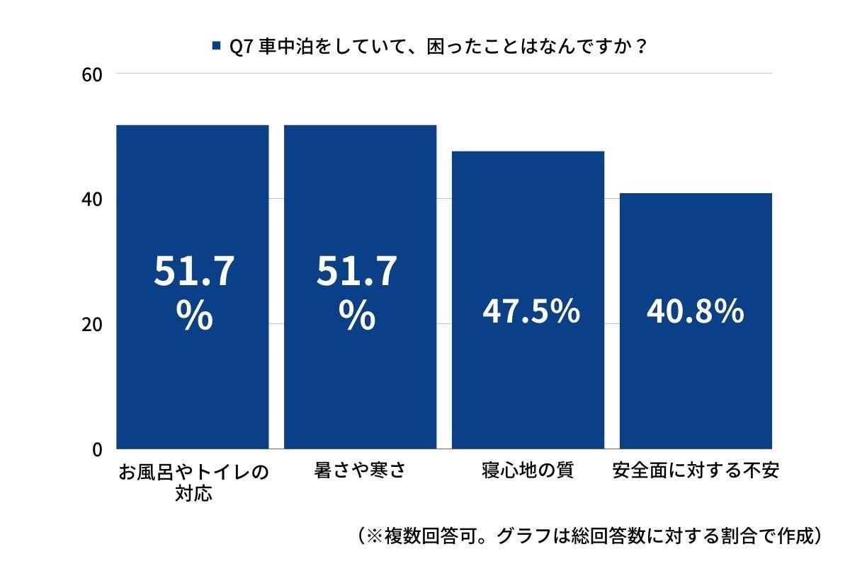 ◆車中泊で困ったこと1位は「お風呂やトイレの対応」と「暑さと寒さ」