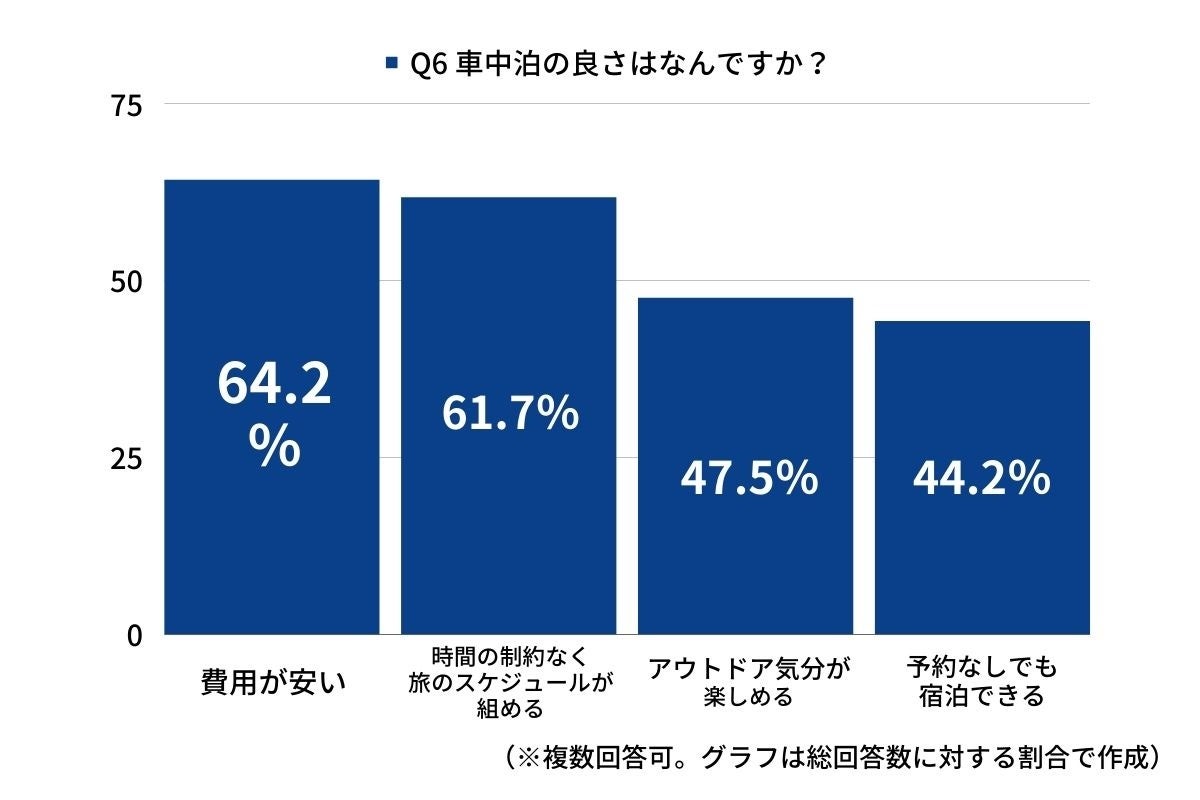 これらの結果から、車中泊を選ぶ理由として「費用が安くて」「アウトドア気分が楽しめて」「自由気ままなスケジュールで旅ができる」という車中泊ファンの意識が見えてきました。