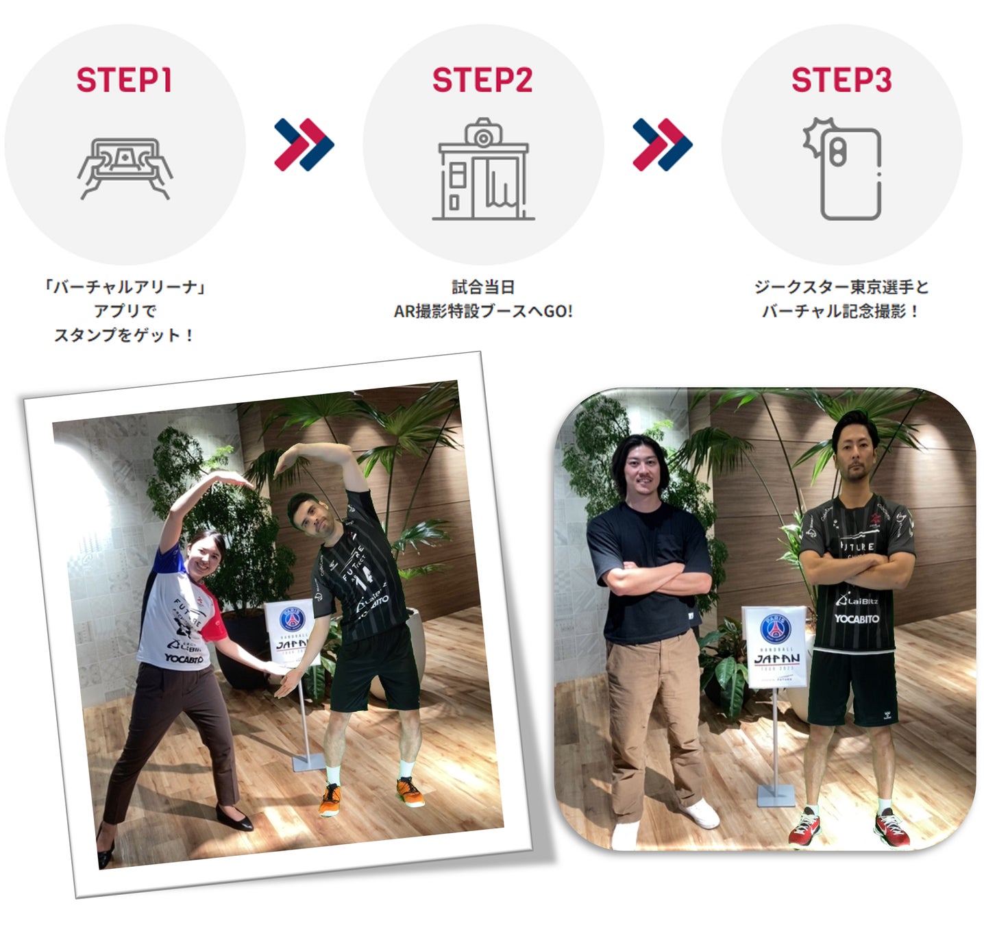 試合会場に設置したAR撮影特設ブースでスマートフォンをかざすと出現するバーチャル選手と一緒に記念撮影をすることができます。出現する選手は様々な動きをするので、画像だけでなく動画を撮影し、SNSに投稿することもできます。ファンはチーム専用アプリの「バーチャルアリーナ」で遊んでスタンプを集めることで記念撮影シーンを増やしたり、レアキャラを出現させたりすることができます。