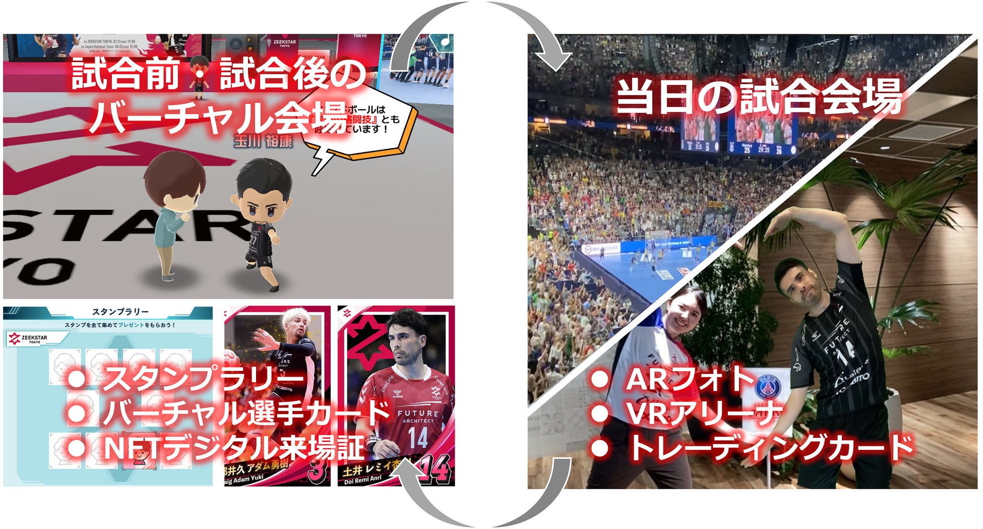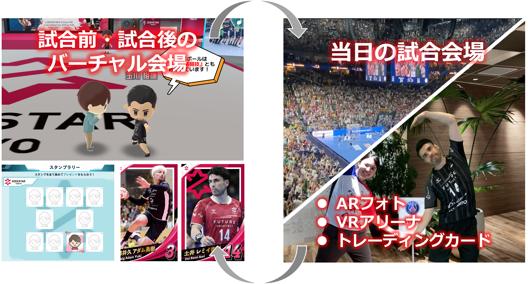 チームオリジナルのメタバース空間で選手アバターと交流することによりスタンプをゲットできる「バーチャルアリーナ」は、試合のない期間でもチームとファンの継続的なコミュニケーション機会を創出します。試合会場ではARフォトで選手と記念撮影することができ、バーチャルアリーナで獲得したスタンプ数に応じて、レアな選手やキャラクターを出現させたり、選手のオリジナルモーションが増えたりします。ファンはバーチャルアリーナで遊べば遊ぶほど試合会場での特典が増える仕組みになっているため、オンラインコミュニケーションと試合会場でのリアルコミュニケーションが相乗効果となり、来場意欲・応援意欲を醸成します。第一弾として2023年7月27日~8月3日にて開催される「パリ・サン=ジェルマン ハンドボールジャパンツアー2023」 *1にて連動施策を実施いたします。
