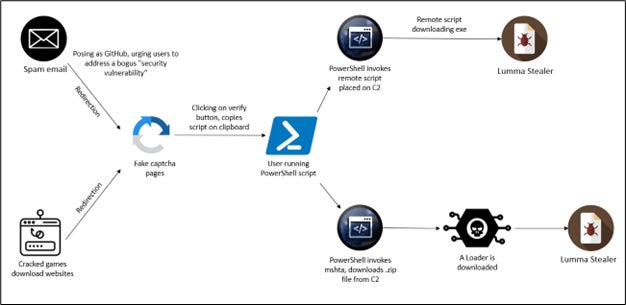 感染連鎖は、クラック版のゲームソフトウェアのダウンロードURLとGitHubを装ったフィッシングメールの2つの主要なベクトルを通じて作動します。どちらの場合も、ユーザーは悪質なCAPTCHAページにリダイレクトされてスクリプトが実行、マルウェアがダウンロードおよびインストールされます。多層的な暗号化の使用は、さらに検出と分析を複雑にし、これらの攻撃をより高度なものにし、セキュリティ防御を困難にします。
