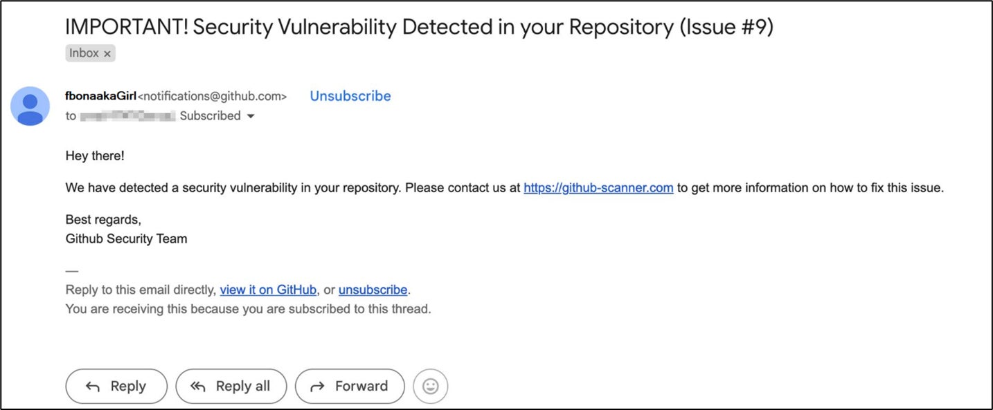 第2の経路では、ユーザーはフィッシングメールを受け取り、「セキュリティ脆弱性」があるという偽の警告を解決するように促されます。特にGitHubのユーザーがターゲットにされやすい傾向にあります。こういったメールには、偽のCAPTCHAページにつながるリンクが含まれています。