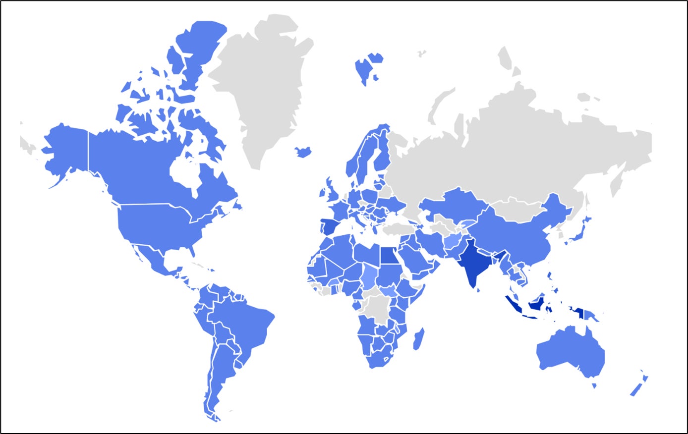 以下の地図は、偽のCAPTCHA URLにアクセスするデバイスのジオロケーション(ユーザーの位置情報を取得する技術や機能)を示すもので、攻撃対象が全世界的に分布していることが分かります。