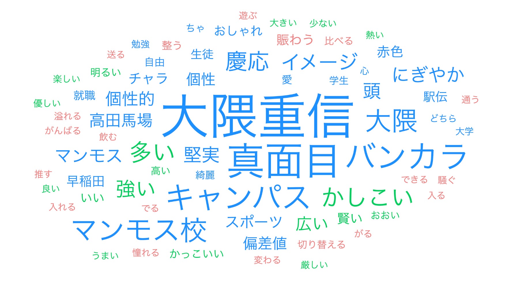 「おしゃれ」と「就職に強そう」は慶應義塾大学の勝利。 その他の5項目のイメージは早稲田大学の方が強いという結果になりました。また、本調査では具体的なイメージも聴取。 フリーアンサーを解析した結果がこちらです。