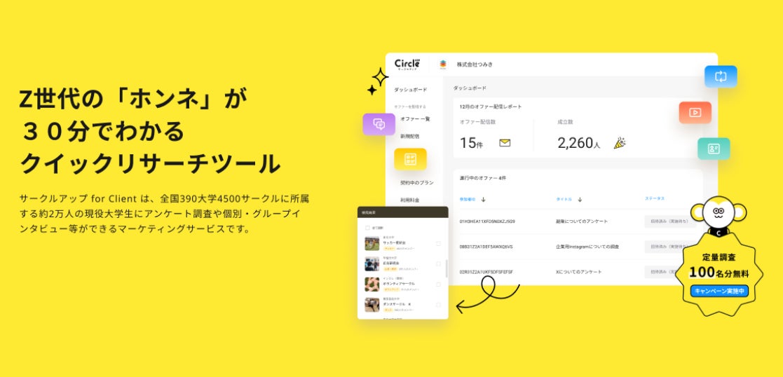 サークルアップは電通若者研究部が自らの研究ツールとして開発し、2022年6月に当社が事業売却を受けたクイックリサーチツール。約2万人の現役大学生が登録しており、100サンプルの調査が10〜30分で完了するなど、そのスピード感が特徴で、多くの企業様のマーケティング活動やリクルーティング活動にご活用いただいています。