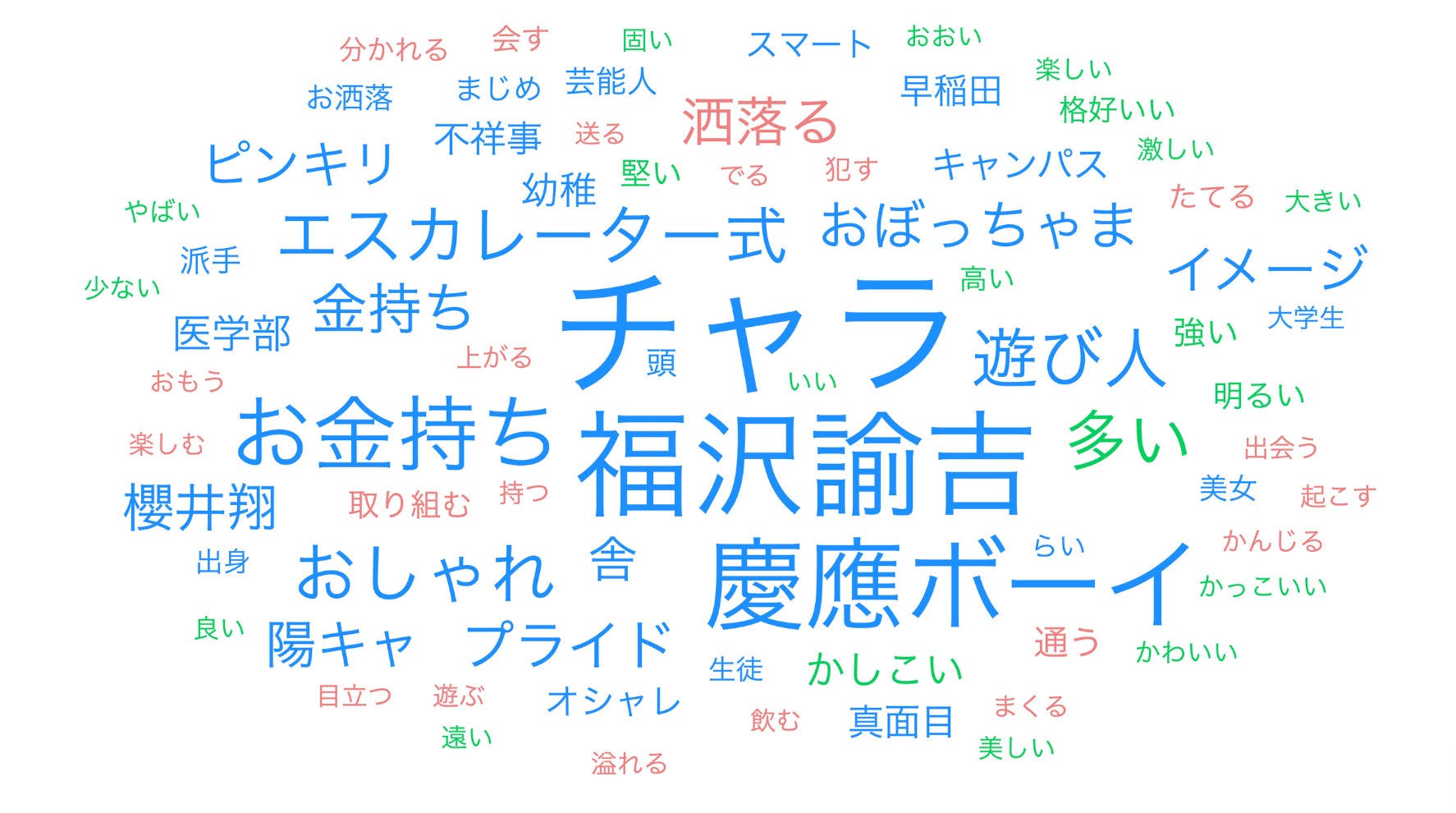 早稲田と同じく創設者の「福沢諭吉」という言葉が強い一方で、それより大きく出たのは「チャラ」というパワーワードでした。おしゃれなイメージも強い分、チャラいイメージもあるのでしょうか。