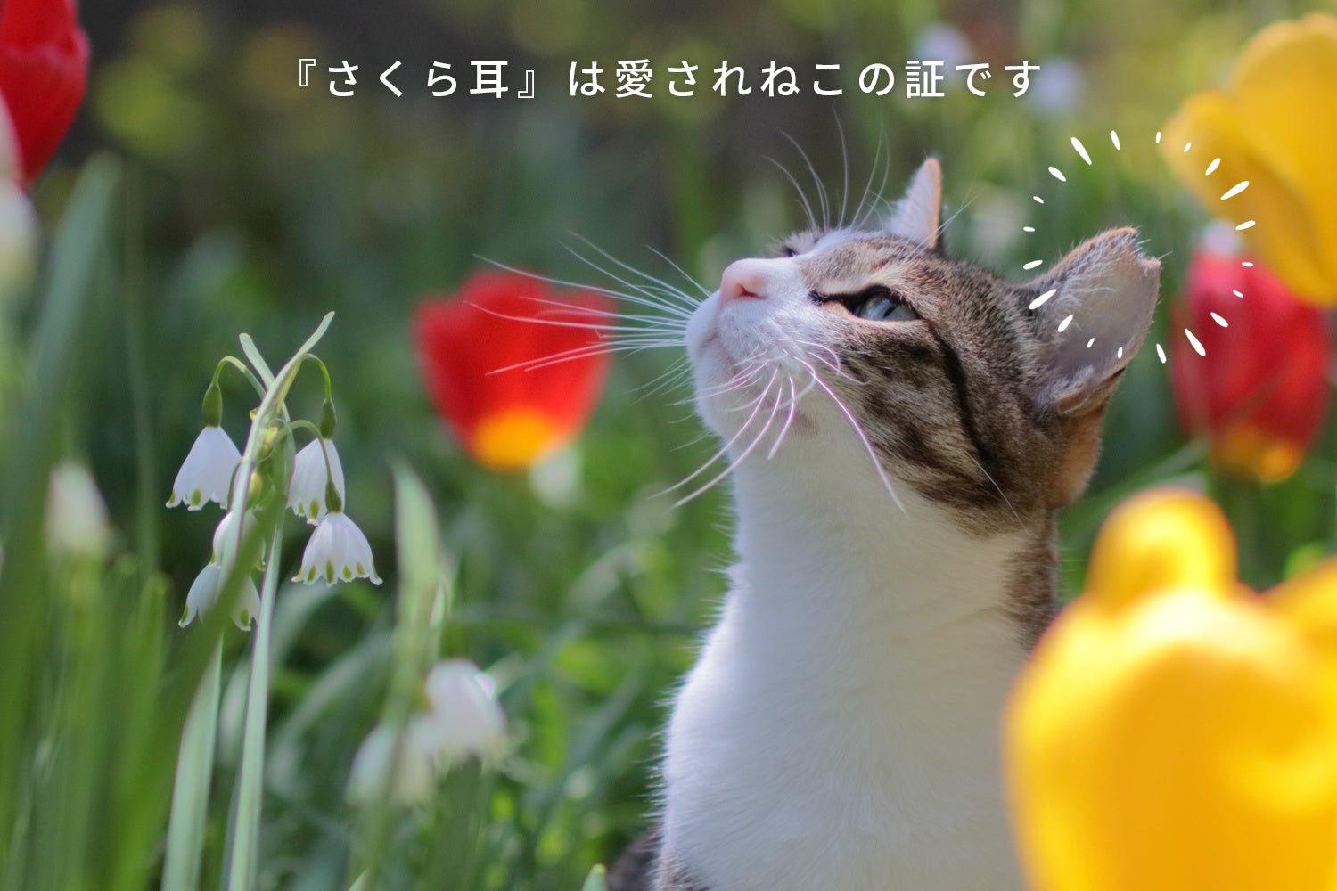 飼い主のいない猫に対し、TNR(Trap/捕獲し→Neuter/不妊去勢手術を行い、その目印として耳先をさくらの花びらのようにV字カットする→Return/元の場所に戻す)を実施することで繁殖を防止し、「地域猫」「さくらねこ」として一代限りの命を全うさせ、飼い主のいない猫に関する苦情や殺処分の減少に寄与する活動です。