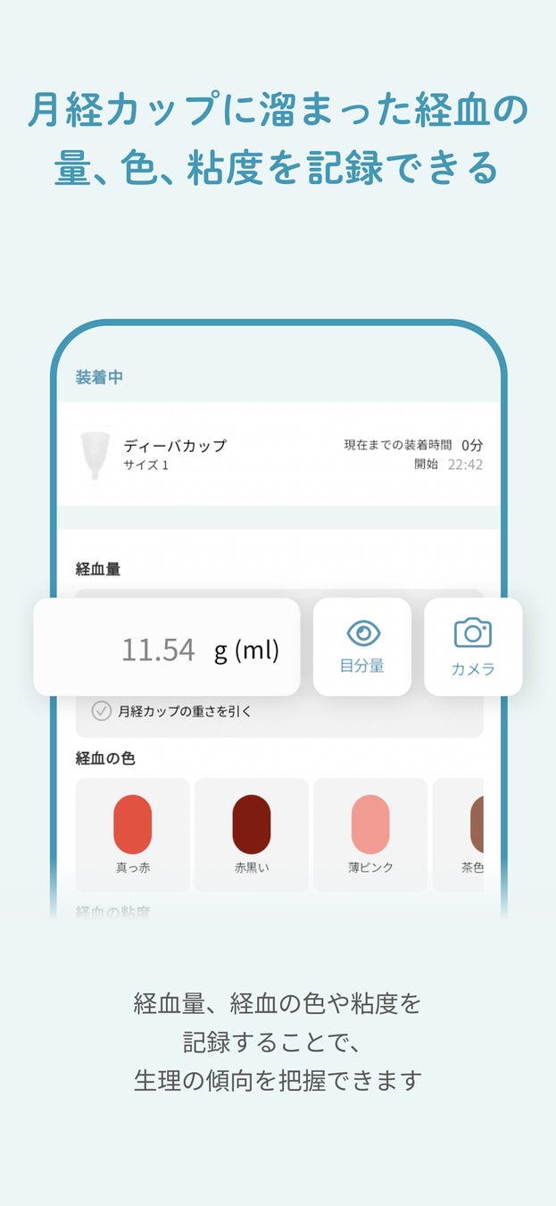 国内の主な月経カップブランドに対応。月経カップに溜まった経血の量、色、粘度を記録できる
