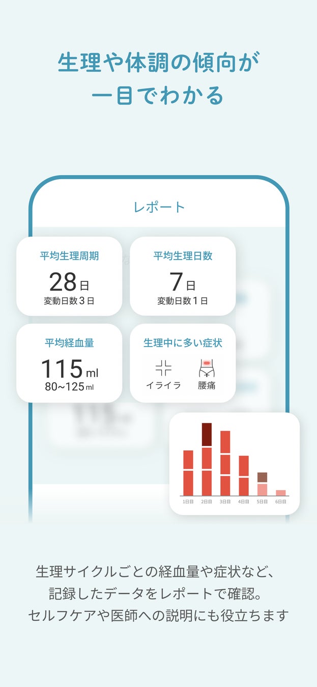生理サイクルごとの経血量や症状など、記録したデータをレポートで見ることができます。セルフケアや医師への説明にも役立ちます。