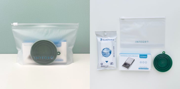 内容物:ミニスケール、折りたたみコップ、ウェットティッシュ、収納ポーチ