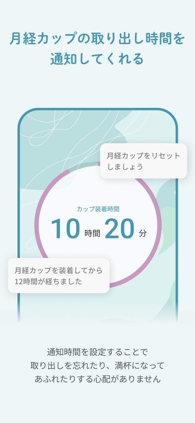 通知時間を設定することで、取り出しを忘れたり、満杯になってあふれたりする心配がありません。生理を忘れて安心して過ごせます。