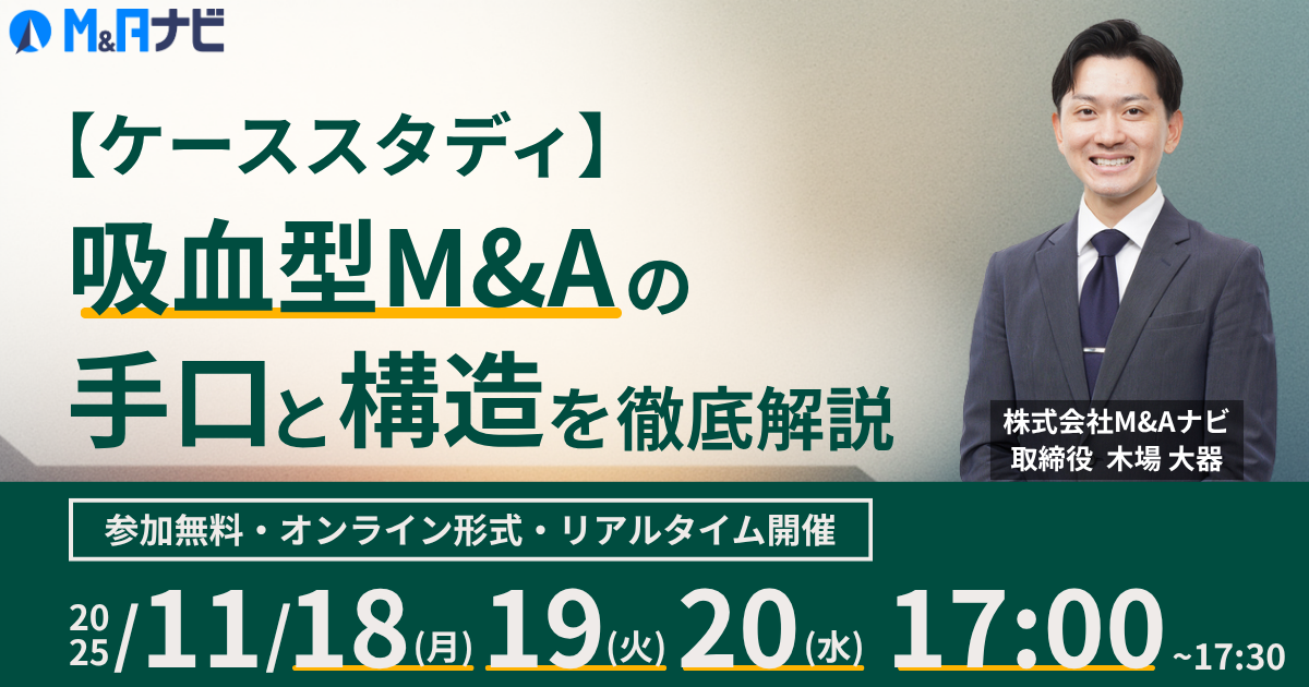 M&Aテクノロジーを展開する株式会社M&Aナビ(本社:東京都品川区、代表取締役:瀧田 雄介、以下「当社」)は、中小企業の経営者向けにケーススタディ形式で吸血型M&Aについて解説するセミナーを2025年11月17日(月)、18日(火)、19日(水)の17時00分から開催いたします。