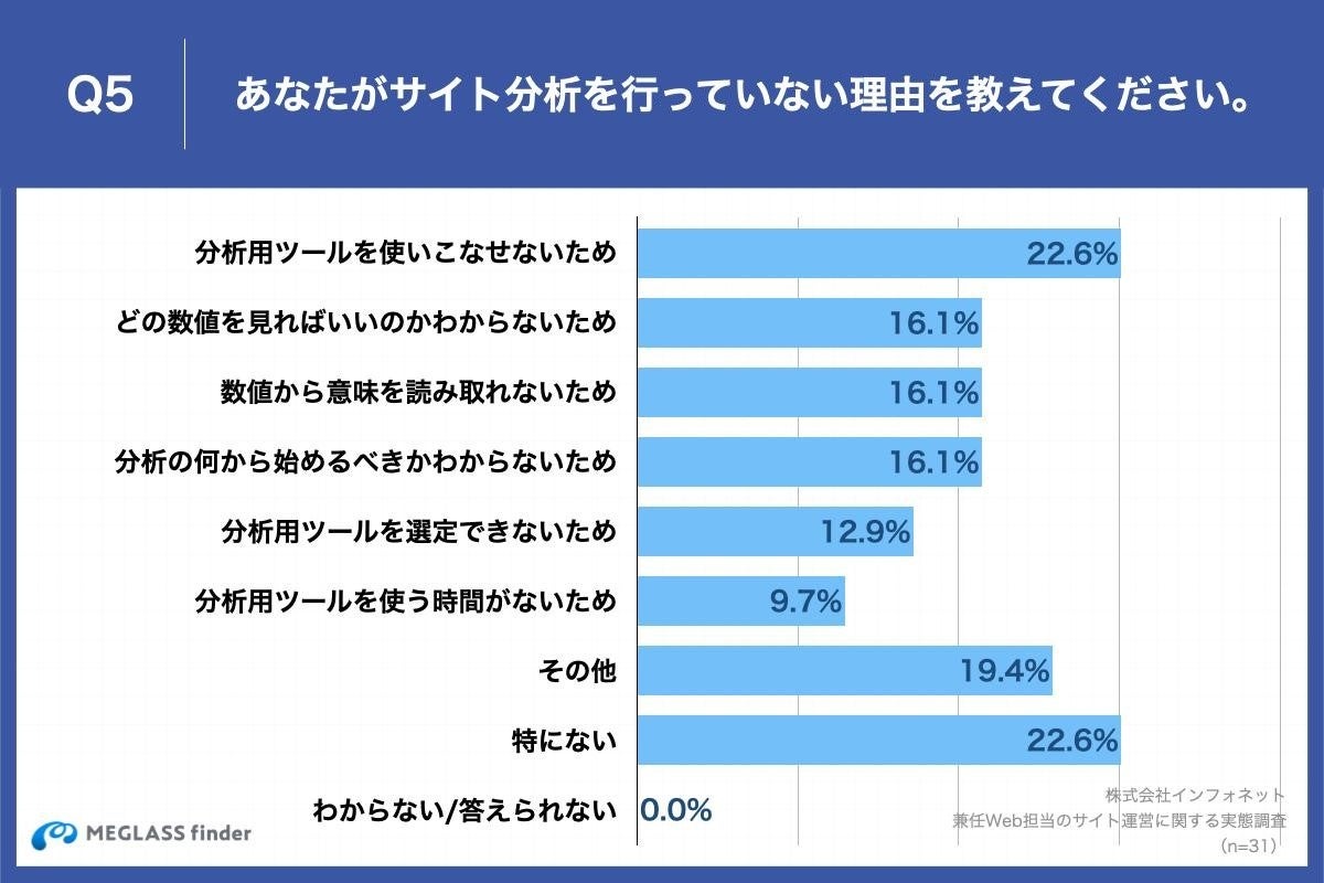 Q2で「行っていない」と回答した方に、「Q5.あなたがサイト分析を行っていない理由を教えてください。(複数回答)」(n=31)と質問したところ、「分析用ツールを使いこなせないため」が22.6%、「どの数値を見ればいいのかわからないため」が16.1%、「数値から意味を読み取れないため」16.1%という回答となりました。