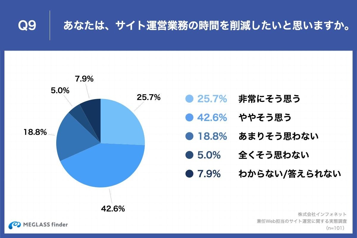 「Q9.あなたは、サイト運営業務の時間を削減したいと思いますか。」(n=101)と質問したところ、「非常にそう思う」が25.7%、「ややそう思う」が42.6%という回答となりました。