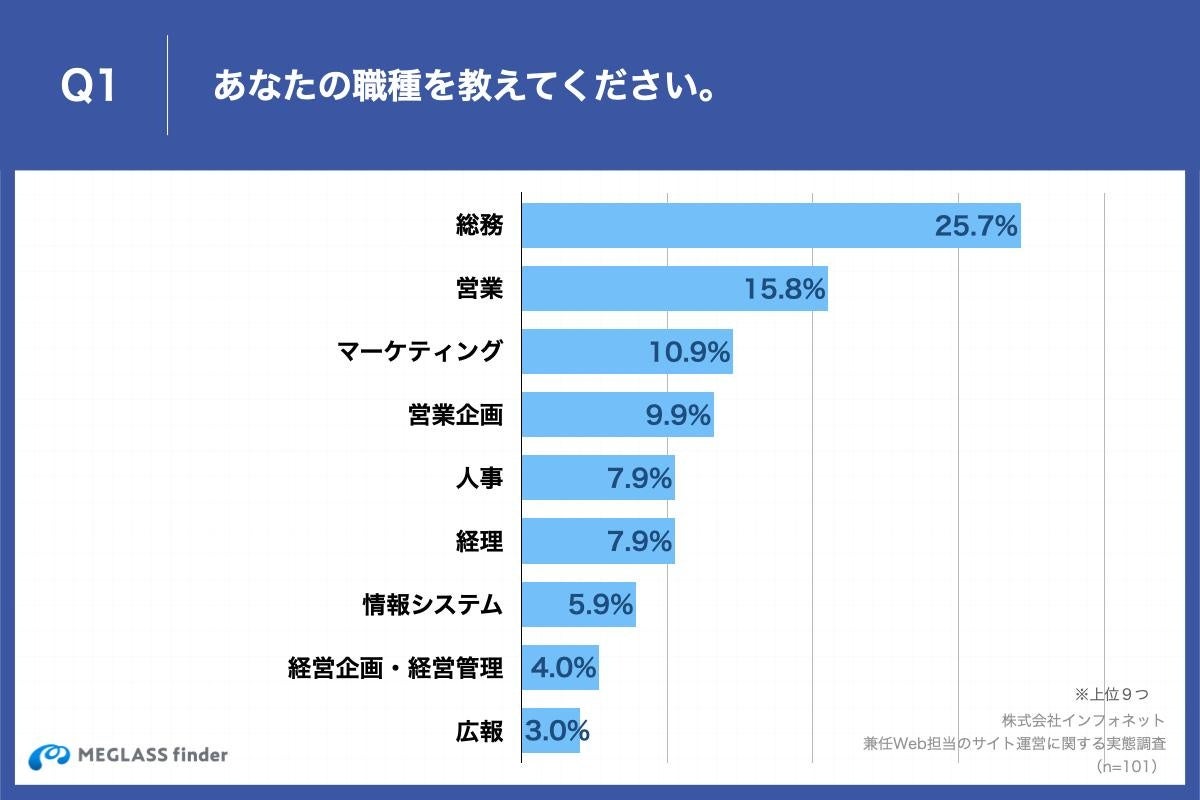 「Q1.あなたの職種を教えてください。」(n=101)と質問したところ、「総務」が25.7%、「営業」が15.8%という回答となりました。