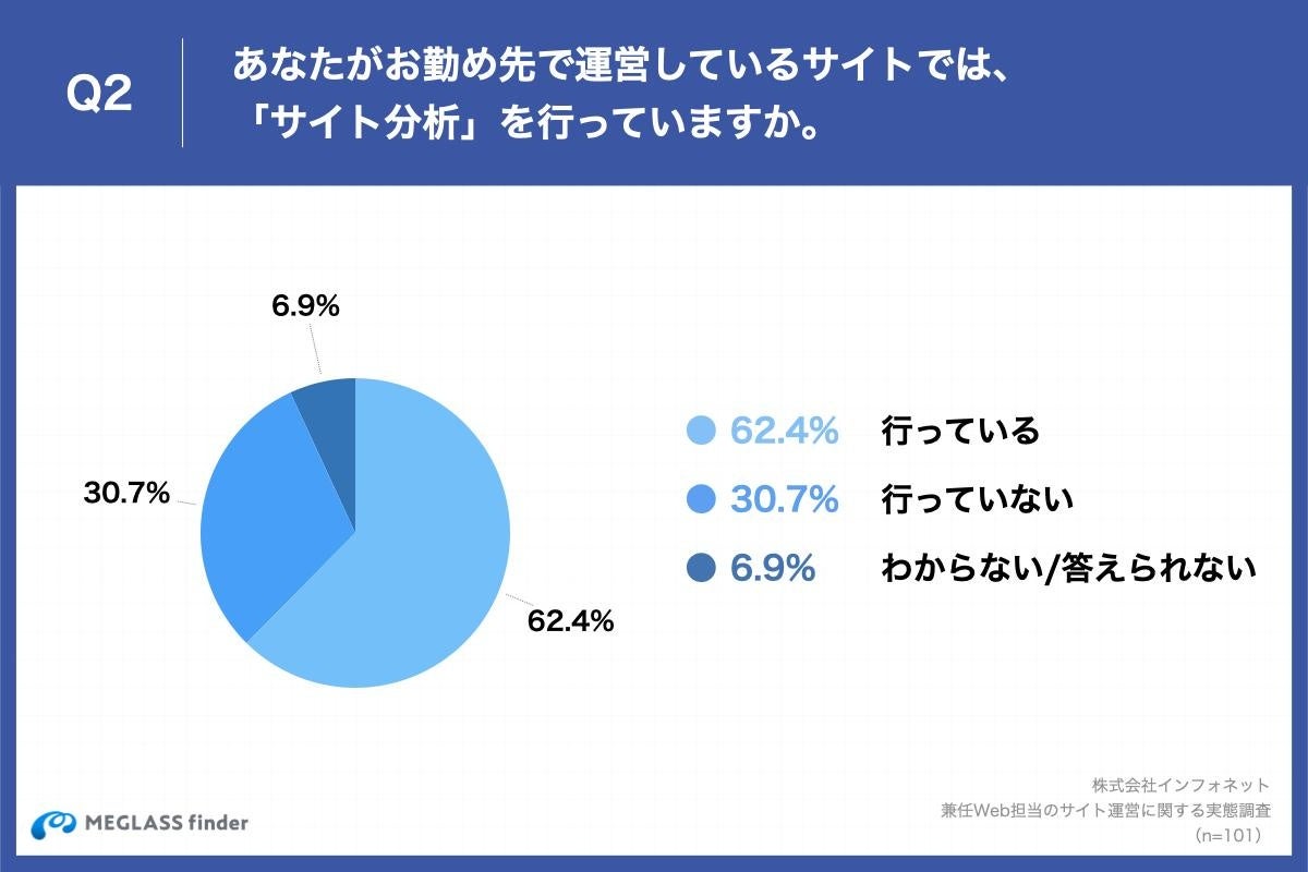「Q2.あなたがお勤め先で運営しているサイトでは、「サイト分析」を行っていますか。」(n=101)と質問したところ、「行っている」が62.4%、「行っていない」が30.7%という回答となりました。