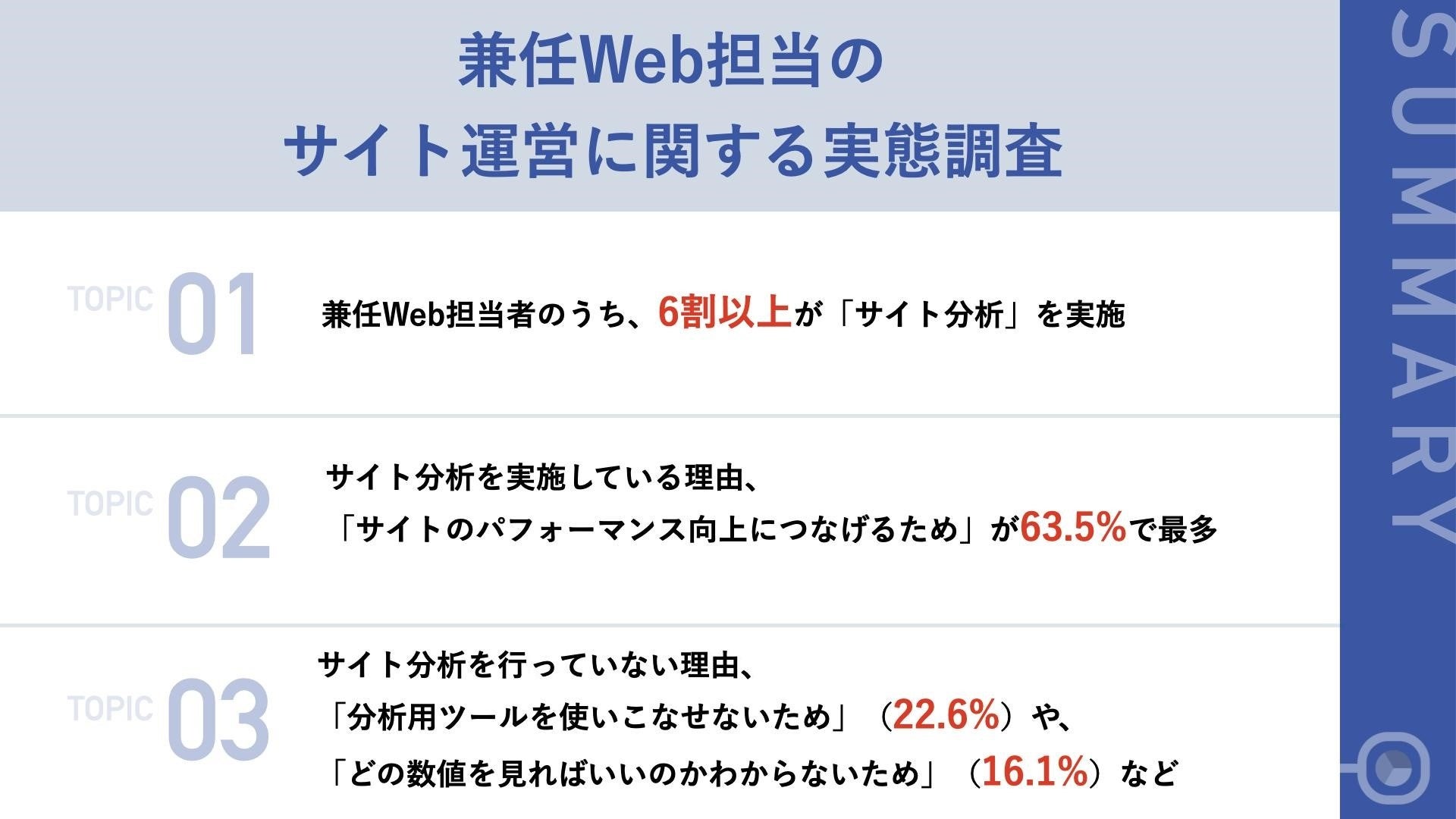 まず、勤務先で運営しているサイトで、62.4%が、「サイト分析」を行っており、理由としては「サイトのパフォーマンス向上につなげるため」や「サイトの問題点を把握するため」が挙がりました。一方で、サイト分析を実施していない方のうち半数以上が、サイト分析を行う「必要性」を実感していながらも、「分析用ツールを使いこなせないため」や「どの数値を見ればいいのかわからないため」などの理由で実施できていないことがわかりました。また、74.3%が、サイト分析は「重要」と捉えており、「サイトの運用」や「サイトの分析・レポート」に時間をかけています。