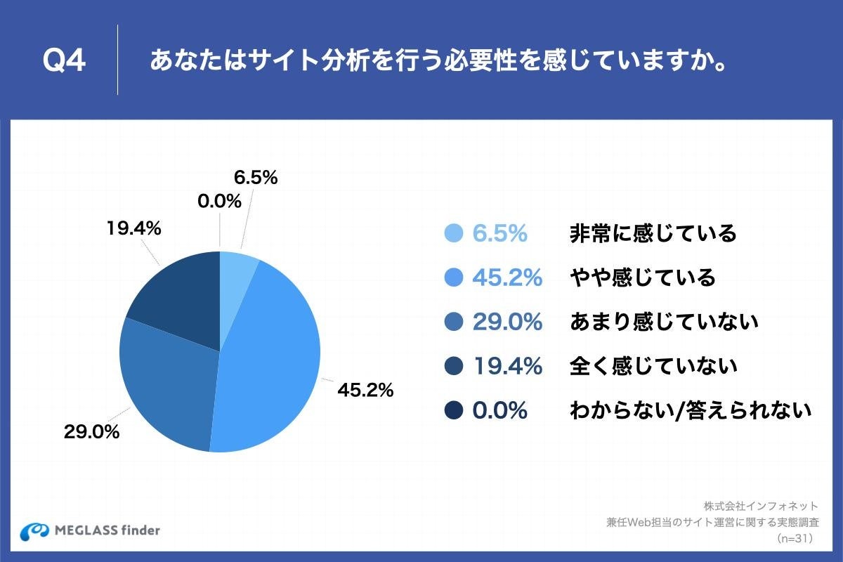 Q2で「行っていない」と回答した方に、「Q4.あなたはサイト分析を行う必要性を感じていますか。」(n=31)と質問したところ、「非常に感じている」が6.4%、「やや感じている」が45.2%という回答となりました。