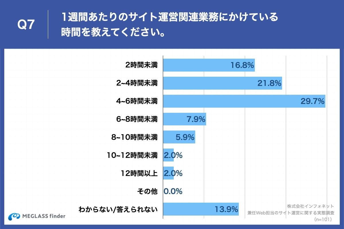 「Q7.1週間あたりのサイト運営関連業務にかけている時間を教えてください。」(n=101)と質問したところ、「4~6時間未満」が29.7%、「2~4時間未満」が21.8%という回答となりました。
