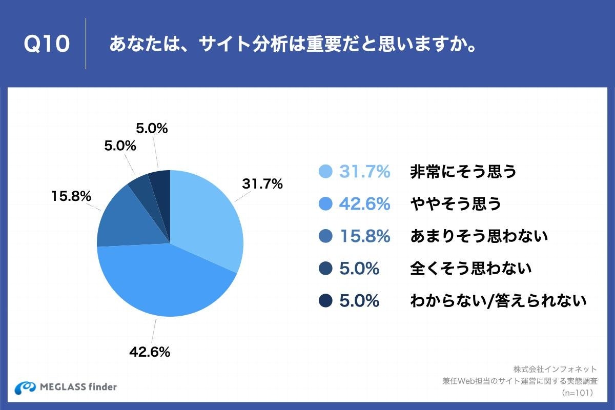 「Q10.あなたは、サイト分析は重要だと思いますか。」(n=101)と質問したところ、「非常にそう思う」が31.7%、「ややそう思う」が42.6%という回答となりました。