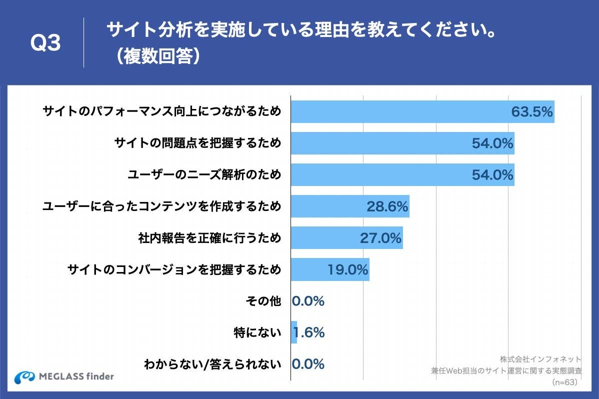 Q2で「行っている」と回答した方に、「Q3.サイト分析を実施している理由を教えてください。(複数回答)」(n=63)と質問したところ、「サイトのパフォーマンス向上につなげるため」が63.5%、「サイトの問題点を把握するため」が54.0%、「ユーザーのニーズ解析のため」が54.0%という回答となりました。