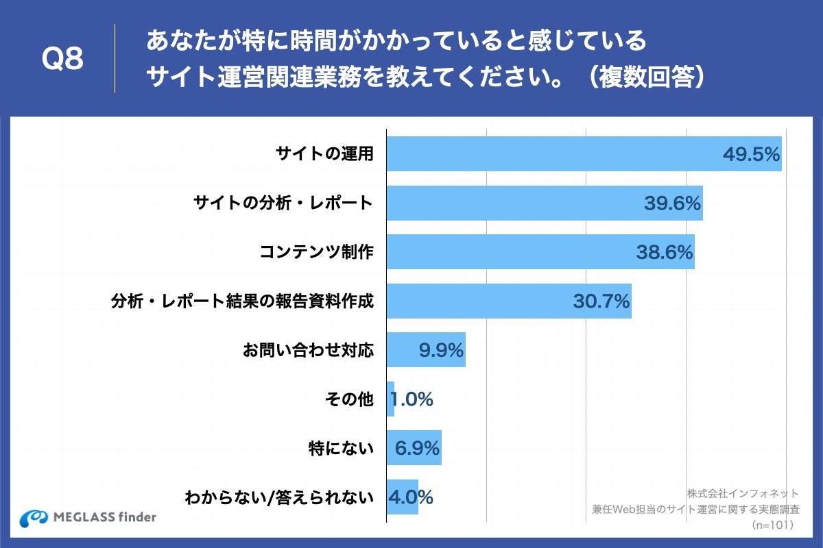 「Q8.あなたが特に時間がかかっていると感じているサイト運営関連業務を教えてください。(複数回答)」(n=101)と質問したところ、「サイトの運用」が49.5%、「サイトの分析・レポート」が39.6%、「コンテンツ制作」が38.6%という回答となりました。