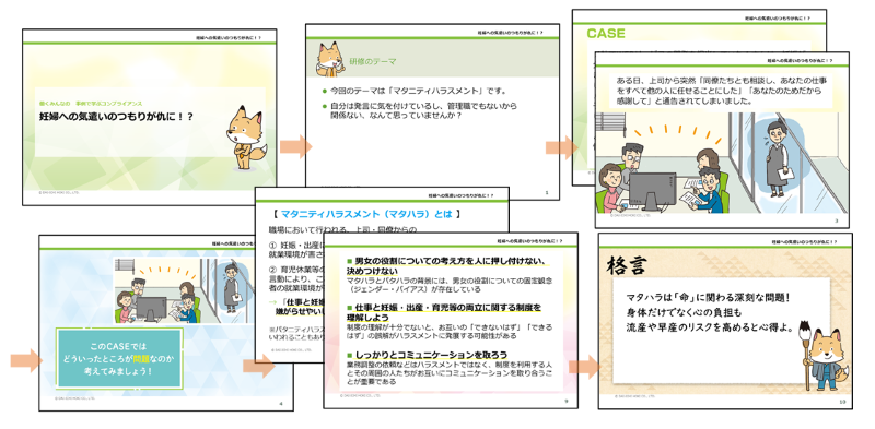 受講者用スライドは、個別学習でも集合研修でも利用可能です。集合研修やオンライン研修の場合は、受講者用スライドを投影または共有しながら、講師用スクリプトの手順で受講者用スライドを読み上げるだけで研修を行うことができます。パワーポイント形式なので各職場や受講対象者にあわせてカスタマイズでき、またペーパーレス化にも対応可能です。