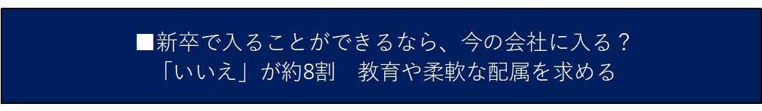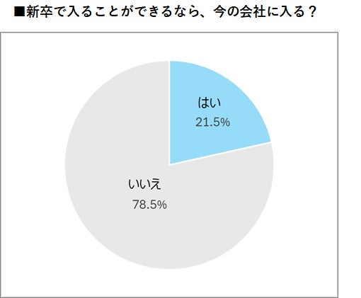 「新卒で入ることができるなら、今(離職中の方は前職)の会社に入りますか?」という質問では、「いいえ」(78.5%)が約8割となり、「はい」(21.5%)の3倍超でした。