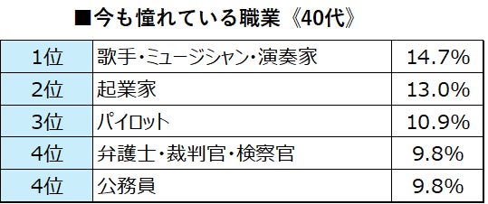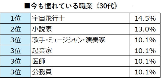 子どもの頃に憧れていて今も憧れている職業を3つまで選んでもらい、年代別に集計しました。上位には、起業家、パイロット、医師、弁護士・裁判官・検察官などがランクインしました。