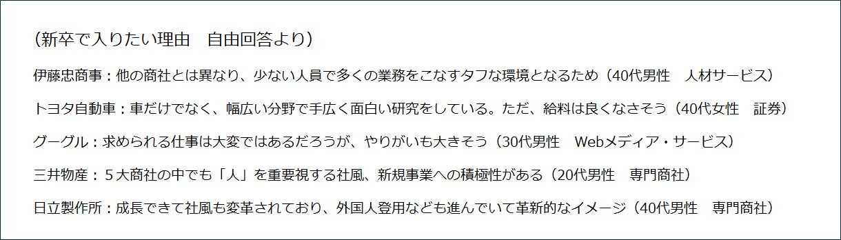 一方、今の会社に入りたくない理由は、「ワークライフバランスを考慮し業務負荷が軽くなったため、新卒の成長スピードが遅い」「買収による企業カルチャーの変化」など、時代の変化を反映した回答や、「管理職にならないと給料が上がらない給与体系」「成熟市場で発展しにくい」など会社の閉そく感を指摘する声も挙がりました。