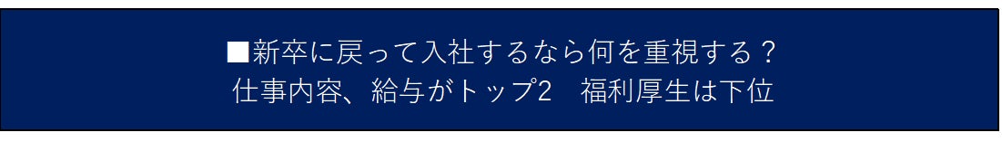 一方で、働き方を見直したい転職希望者が重視する福利厚生、有給休暇などはトップ10に入りませんでした。働きやすさやワークライフバランスも大切ですが、仕事の経験のない新卒であれば、自分の成長につながる仕事やその機会があるほうを選択して早く力を付けることを優先したい、と考える人が多いようです。