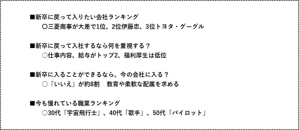 新卒の就職環境が過去最高の売り手市場と言われる今、もし新卒に戻れるならどこの会社に入りたいか、社会人経験を経たからこその会社選びの重視点は何か、今も憧れている職業などについて調べました。