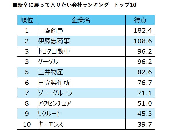 「もし新卒に戻って入り直せるなら、どこに入社したいですか?」という質問に自由形式で企業名を3つまで挙げてもらい、志望順位や属性にあわせて重みづけをして合計得点の多い順にランキング化しました。
