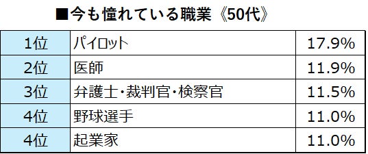 50代のトップはパイロット。「大きな乗り物への憧れ」(50代男性 その他)、「飛行機が好き」(50代男性 精密機器・計測機器)など、今もなお強い憧れを感じさせる回答が多く寄せられました。