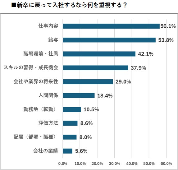 「新卒に戻って入社するなら何を重視する?」(複数回答、3つまで)を聞いたところ、1位は仕事内容(56.1%)で、2位が給与(53.8%)でした。この2つは、転職活動で優先することとしても多くの人が挙げる項目です。3位は職場環境・社風(42.1%)、4位にスキルの習得・成長機会(37.9%)が続きます。ファーストキャリアの職場環境、スキル習得や成長機会が、その後の自身のキャリア形成に影響することを実感している人が多いといえそうです。